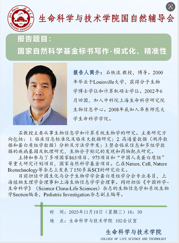 各位老师好, 学院为了提升教师2026年国家自然科学基金申报能力与撰写质量,助力教师准确把握国家自然科学基金项目的申报政策与撰写要点,学院特邀华东师范大学石铁流教授于11月19日下午4:30,在学院102会议室为大家做专题辅导讲座。请老师们积极参加!